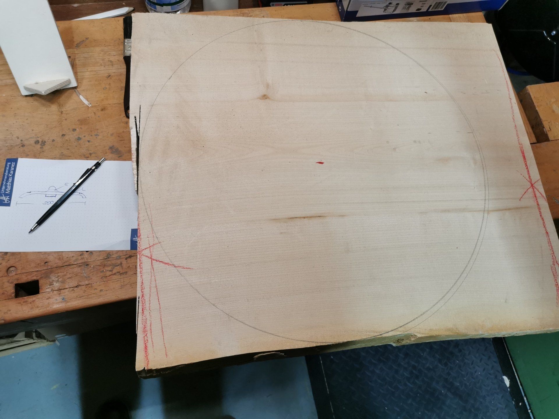 Ritter Ludwig vom Lechtal zog heran und bat mich höflichst, sein verbrauchtes Schild neu zu bauen. Aber aus mehreren schichten Leimholz und zugesägt, nein, das ist eines Ritters nicht würdig. Aus einem Stück soll es sein! Also wird das Schild aus einer Ahornbohle mit Applikationen aus Eiche gedreht. Damit der Ritter ausreichend Schutz hinter seinem Schild genießt, ist der Durchmesser etwa 55cm.